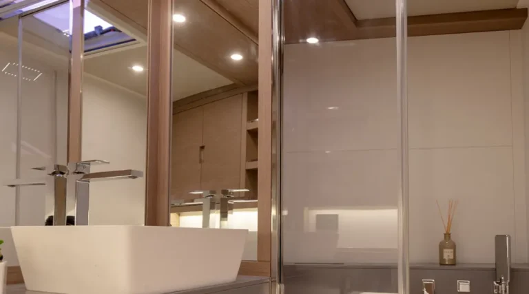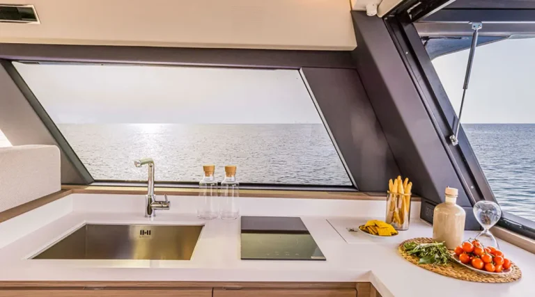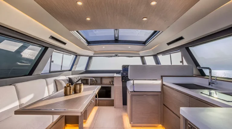 The architecture of the spaces allows two layout options: galley up and galley down. With the first one, it is possible to have a lounge area with TV or a third cabin with a bunk bed on the lower deck level, with the second one, the square of the dinette is even bigger and the kitchen below deck is even more equipped for use even in colder weather conditions.