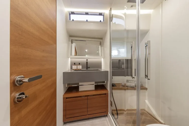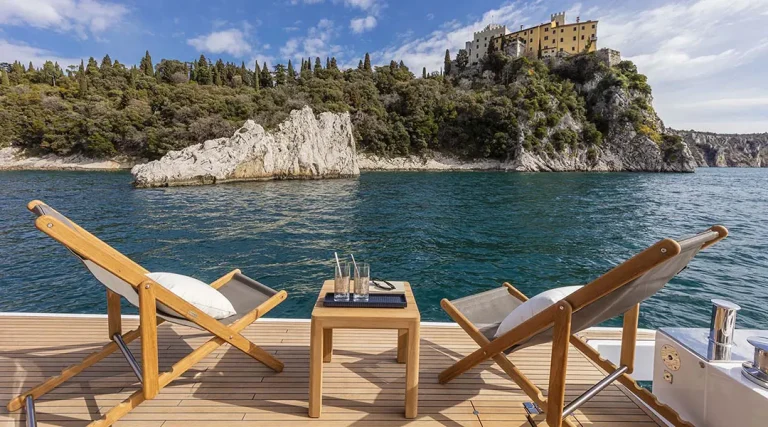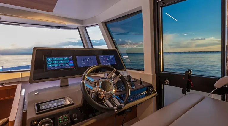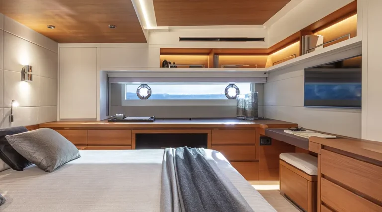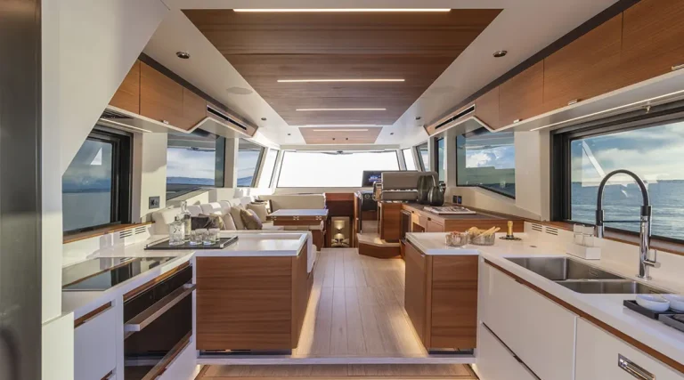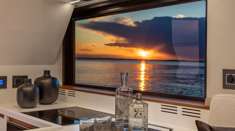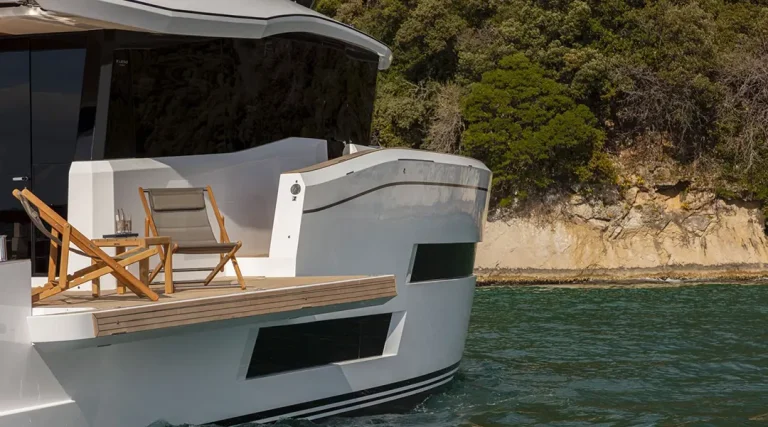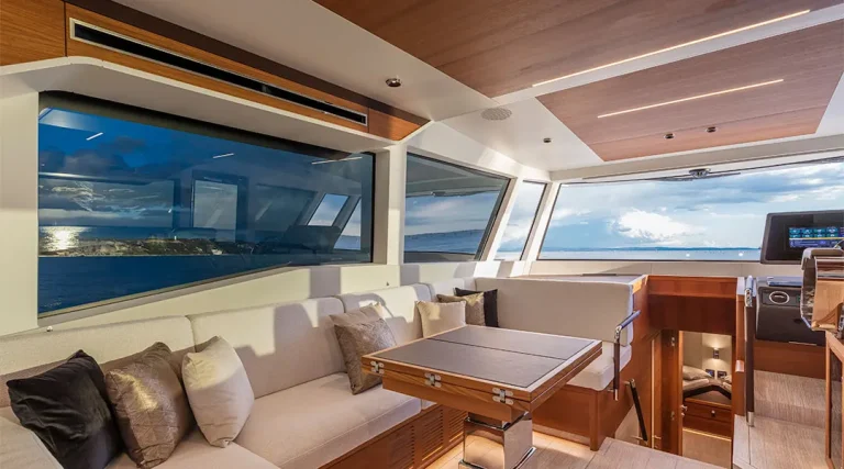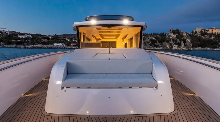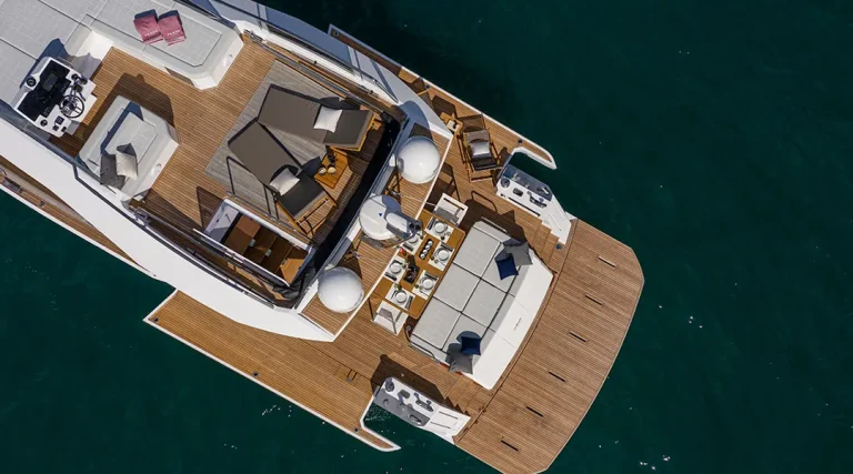 La continuidad entre interiores y exteriores, gracias a los grandes ventanales que se abren y a las dos terrazas laterales abatibles, permite una vida a bordo siempre al aire libre. Porque el verdadero lujo es la libertad sin límites.